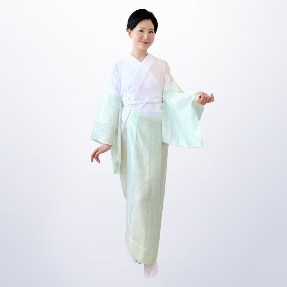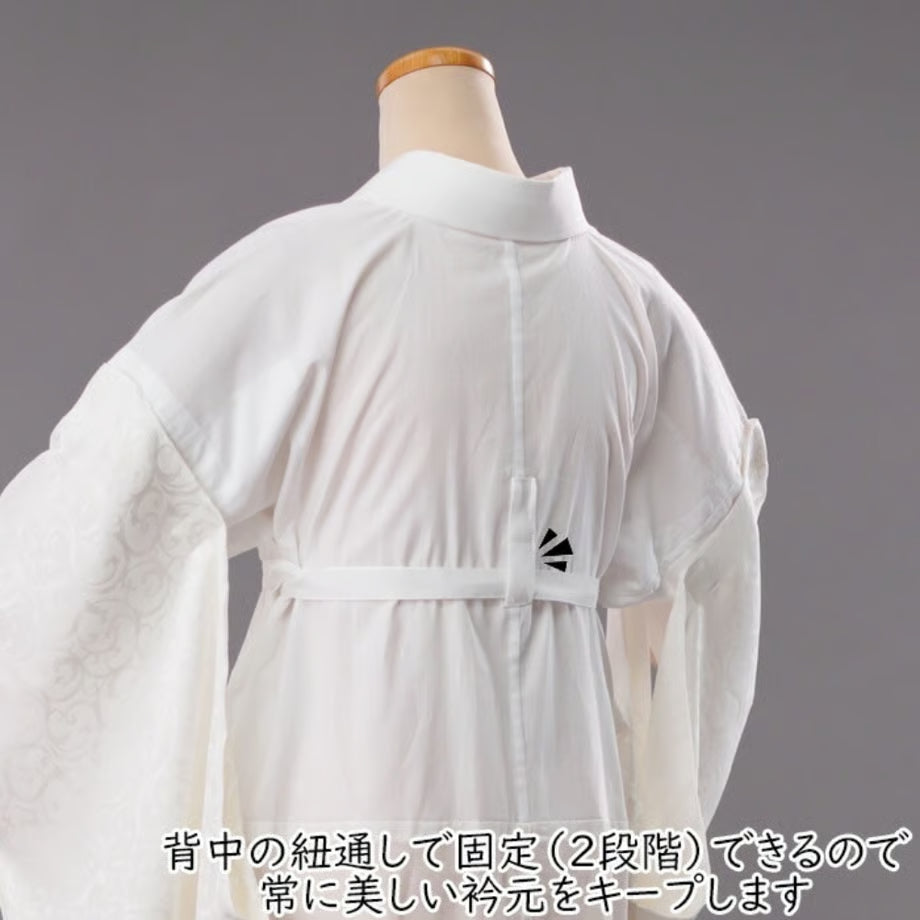 着方は超簡単。付属の紐を通して結ぶだけ。 一般的な長襦袢の着付けで必要な小物(胸紐、伊達締め、コーリンベルト、衿芯など)が一切不要なのも嬉しい。 アイテムを減らすことで、涼しく楽ちんに時間短縮できちゃいます。