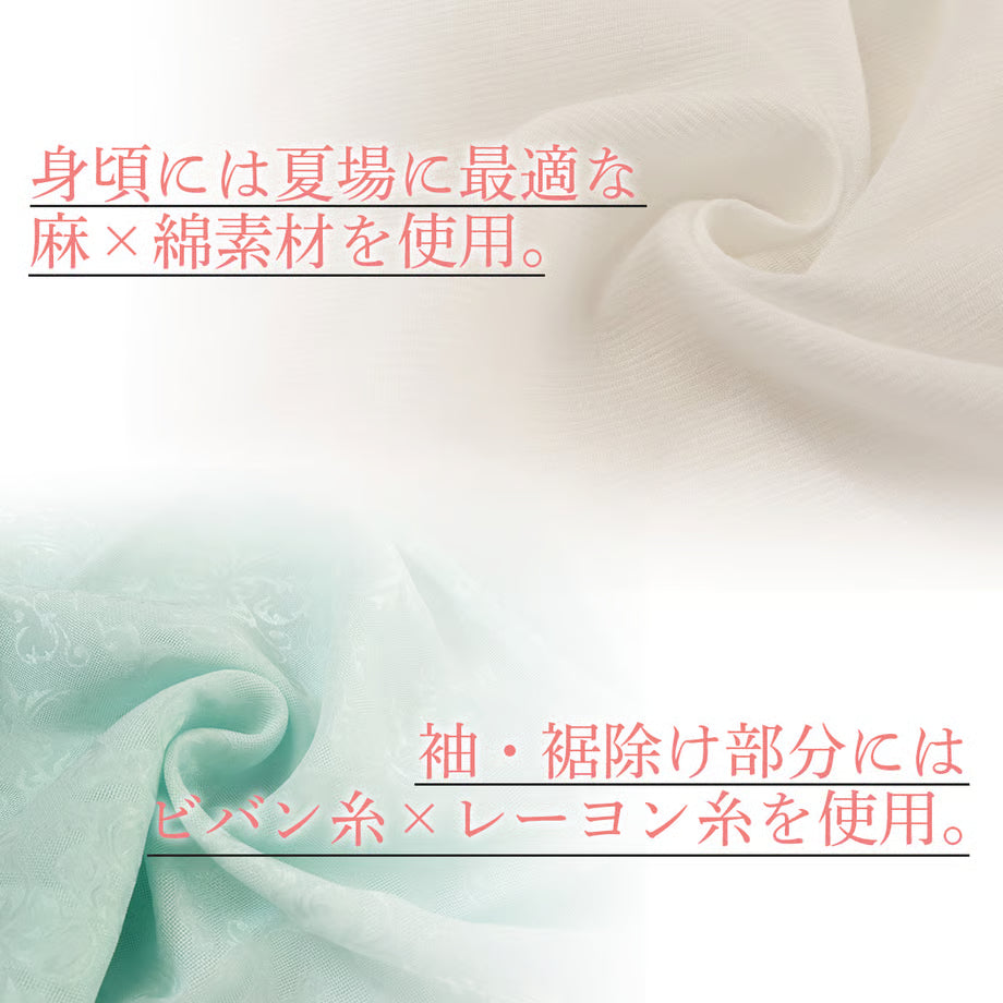 水分に反応するキシリトール成分配合。夏の汗ばんだ肌にひんやりした清涼感が得られます。 素材は、シャリ感があり夏場に最適な麻(15%)に、綿(85%)の柔らかさを掛け合わせたオリジナル素材。 縦に細かく凹凸がある揚柳なので、肌に張りつかず快適です。横糸には冷感素材「ビバン糸」を使用。 ビバン糸はその特徴であるU断面の形状から高い吸水性・速乾性があるため、常に爽やかなドライ感が持続します。 夏だけでなく年間を通して使えます。汗をかきやすい脇部分にはガーゼの汗取りが付いているので、大切な着物をしっかり守ってくれます。
